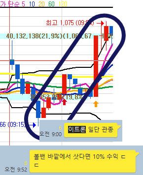 이트론3분봉 입니다. 최근 핫한 동전주 이트론이 천원을 돌파중입니다. 9시 당시에 갭상승 출발하였지만 2번째 캔들에서 바로 돌파가 나오지 않으니 볼밴하단까지 하락하다가 그곳을 터닝포인트로 다시 10시이내 10%이상 상승이 나왔습니다.