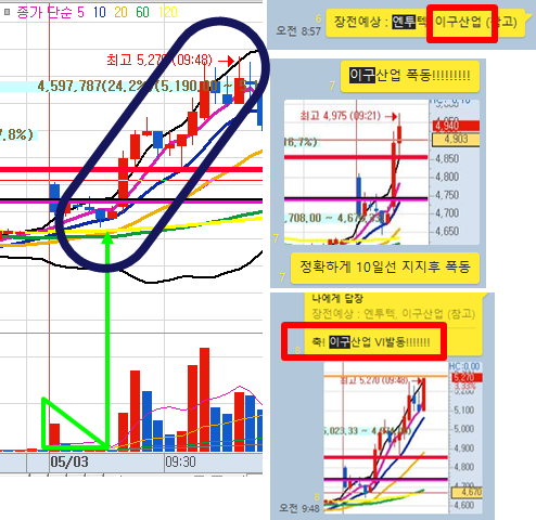 장전 예상종목으로 갭상승 출발이후 10일선까지 일시적인 하락이 있었던 이후 바로 그곳을 정확하게 지지해주면서 48분만에 14%가까운 급등이 나온 종목입니다.