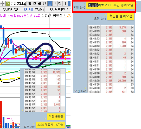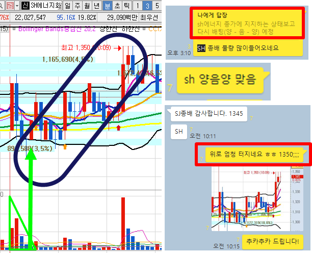 지난주 여러 번 공략한 종목으로 금요일 종가에 일봉차트가 양 - 음 - 양을 미리 예상했었고, 오늘 아침도 큰 거래량이 몰려오면서 상승중이였습니다. 10시 9분에 최고점 1350까지 오르며 수익낼 수 있는 구간이 충분했습니다.