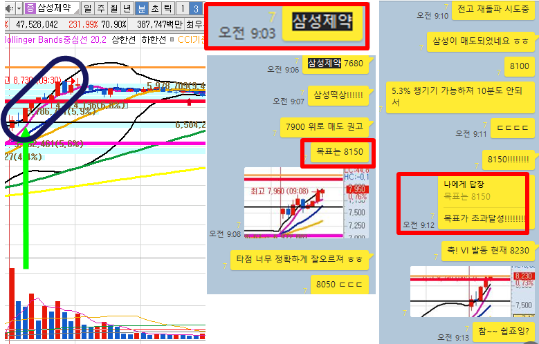 오늘의 시초가 공략종목으로 2번째 캔들 돌파가 나왔고, 정확한 타점 7680원을 찍어준 이후 9시 30분에 최고점인 8730원까지 급등하며 오전장 중 최고 23%이상 큰 시세가 나왔습니다. 당시 매수이후 8150원을 목표로 잡았지만 그 보다 한참더 급등한 8730원까지 급등한 사실이 카톡내용을 보면 고스란히 작성되어있습니다.