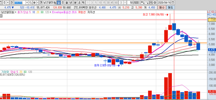 그 종목은 이낙연 테마주인 남선알미늄 이였으며, 제가 생각하는 지지라인을 계속 깨면서 크게 하락을 하였습니다. 그 반면에 동시에 찾아서 공유드린 아난티라는 종목은 장중 상한가 진입하는 어이없는 상황이 발생하였습니다.