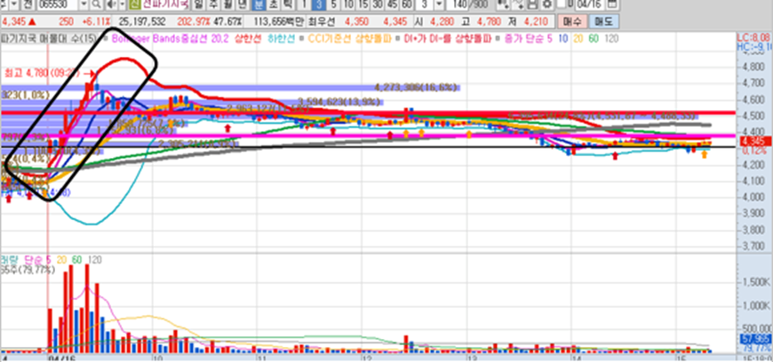전파기지국은 일봉이 매우 좋았습니다. 그리고 시초가에 갭상승이 나왔지만 전일고점 아래에서 가격이 위치해있었으며, 발견 직후에 바로 전일고점 돌파 및 2차저항을 돌파하면서 9시27분에 최고점인 4780원까지 상승했습니다. 이 때의 상승폭이 무려 11%이상 나왔습니다.