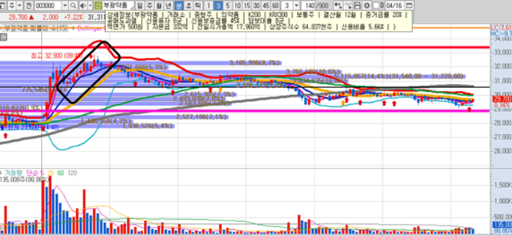 우상향 하고 있는 부광약품의 일봉차트 입니다. 시세가 본격적으로 나기 시작한 한달전부터 자주 매매했던 종목입니다. 앞으로 이 종목을 신규 진입하기에는 다소 부담스러운 위치까지 왔지만, 거래량 많은 장중 전일고점 단타 대응이라면 여전히 해볼만 하다고 봅니다.