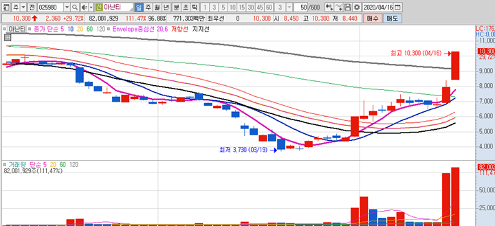 아난티는 3월 19일 최저점인 3730원 대비하여 현재 가격이 무려 2.5배 가량 오른 종목 입니다.