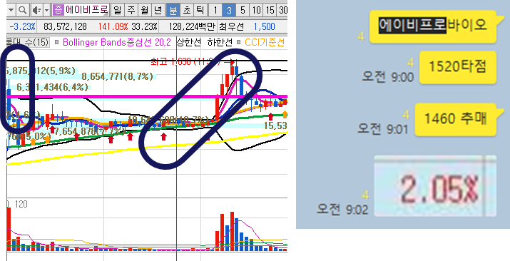에이비프로바이오3분봉 입니다. 9시 갭상승 했었고 2번에 나눠서 매매하고 2%수익으로 바로 매도 했었습니다. 그러나 60일선에서 하락이 멈추고 다시 상승세가 나왔으며 오전장중 최고 5%이상 상승이 나오며 피봇1차저항을 돌파한적이 있습니다.
