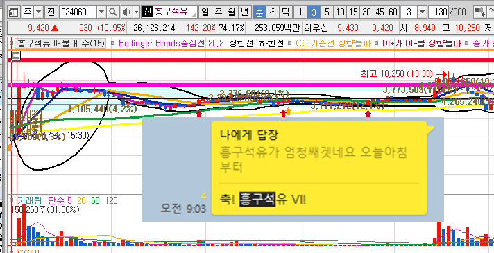 흥구석유3분봉 입니다. 장전 급등을 예상한 종목으로 개장직후 20%까지 상승하다가 잠시하락이 있었고 장중최고 21% 급등이 있었던 종목입니다.