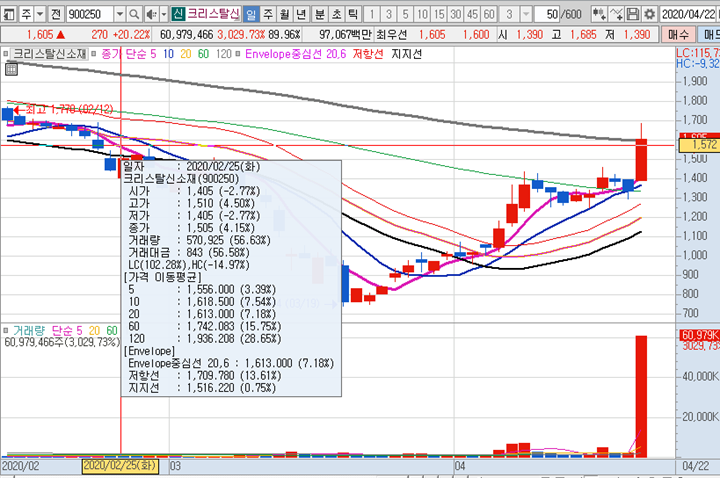 크리스탈신소재 입니다. 오늘 시초가부터 크게 상승함과 동시에 거래량이 엄청나게 몰린 종목입니다. 이렇게 시초가부터 이미 크게 급등한 종목은 바로 접근하기는 누구나 겁이나는 매매타점이며 가격이 지속적으로 상승하였지만 매매가능한 구간은 2번정도 보입니다. (화살표 그림 참고) 이종목은 너무 멋지게 아침에 20%이상 상승하였습니다. 매매를 실제 하지는 못했고 이렇게 장이 종료된 후에 복기하면서 보게되는데, 안전한 타점에서만 매매했다면 큰 수익이 가능했던 종목 입니다.