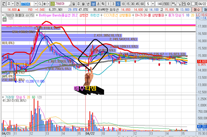 가비아의 일봉차트를 보시면, 4월 14일 을 기점으로 시작하여 계속적인 상승세가 이어지고 있습니다. 4월 17일이 최근 고점인 17300원인데, 주가가 현재 5일선상부에서 놀고 있는데 꾸준히 수급이 바쳐준다면 다시 전고점을 만나러갈만한 차트로 보입니다. 겁이나면 매수하고 주구장창 들고 있는게 아니라 저처럼 분봉상 의미있는 이동평균선과 거래량을 확인하고 단타로 들어가셔도 되고, 만일 이 종목이 12450부근까지 하락한다면 그때한번 물량 크게 실어볼 생각은 있습니다.