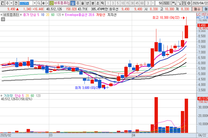 일봉상 계속 우상향하는 비트컴퓨터의 차트모습입니다. 이제 더는 제영역이 아니기에 이 부근에서는 접근하지 않을 것이며 설사 매매하더라도 정말 짧게 전일고점을 보면서 단타매매를 할 것 같습니다. 7500원 부근에서 입벌리고 있으면 몇일안에 매수되지 않을까 생각합니다^^
