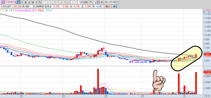 며칠전 최저점에서 공유한 이후로 지속적으로 상승이 나왔고 오늘은 급기야 오전 장중 상한가 근처(27%이상) 상승이 나왔습니다. 오늘이 일봉상 120일선 위로 강력하게 돌파한 날 입니다.