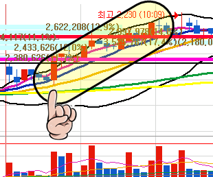 장전예상 종목으로 3%갭상승 출발이후 볼밴상단을 지지하며 양봉6개가 나왔고 15분만에 5%이상 상승이 나왔습니다.