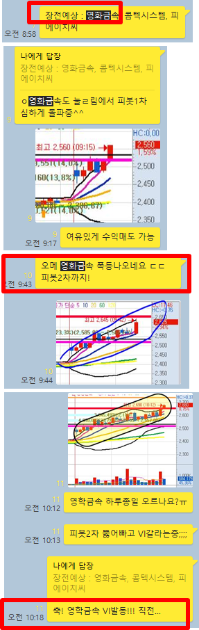 장전예상 종목으로 3%이상 갭상승 출발후 5일선 눌림목을 지지하고 지속적으로 상승을 하며 (전일고점) → (피봇1차저항) → (피봇2차저항)을 뚫으며 1시간만에 11%이상의 급등이 있었고, 10시15분 VI가격 근처까지 최고점 13%이상 급등이 나왔습니다.