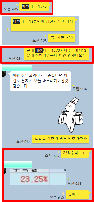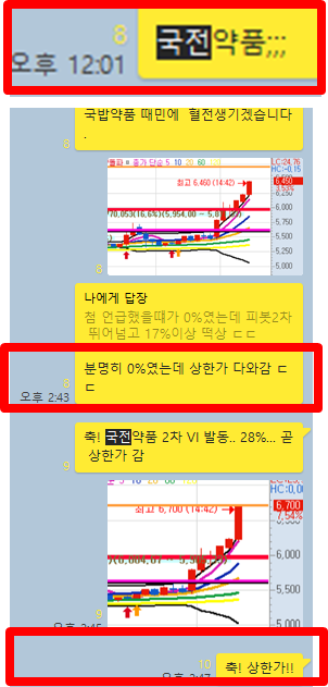 오늘은 하락장이지만 톡방에서 언급된 종목중 3종목이나 상한가에 가는 대박을 쳤습니다. (국전약품, 에쎈테크, 신일전자 : 모두 상한가^^)