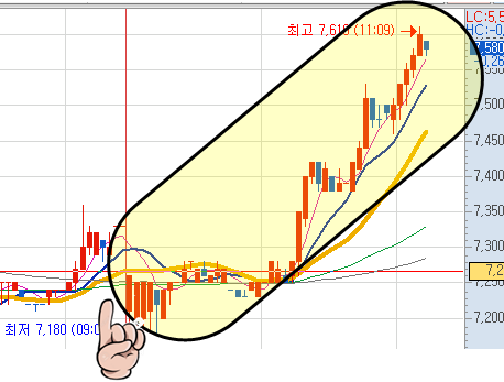계속 공략하고 있는 종목으로 오늘도 시초가 양봉3개가 나오며 8%가까운 급등이 나왔고 60일선을 지지하며 오전장중 최고 14%가까운 급등이 나왔습니다.