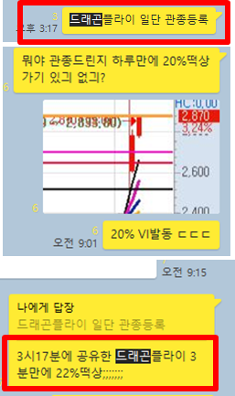 오늘은 새롭게 선정한 당일 주도주 모두가 급등이 나온 좋은 날입니다. 특히, 어제 장 마감에 공유한 드래곤플라이는 3분만에 23%급등이 있었습니다.