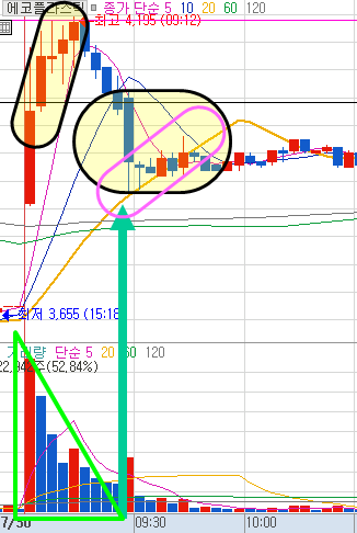 개장이후 양봉5개가나오며 상승추세였던 종목으로, 처음부터 눌림목을 공략하고자 했던 종목입니다. 9시12분 전일고점까지 상승하며 14%이상 급등이후 그 곳 전일고점이 저항대로 작용하며, 하락하기 시작했으며 10일선과 20일선에서 2번에 걸쳐 각각 매수하였으며, 결국 약수익으로 나올 수 있었던 종목입니다. 10일선 매수이후 갑작스러운 폭락으로 손절할 틈도 없었지만 오히려 그 갑작스러운 하락을 매수의 기회로 삼고 물량을 많이 탓던게 승리의 요인이였다고 봅니다. 차트가 그림대로 정확하게 움직여줬고 욕심없이 10시이내 매도하고 떠날 수 있었습니다. 계속 홀딩시에는 10시이후 지지부진했기 때문에 수익을 챙길 수가 없었겠지요..