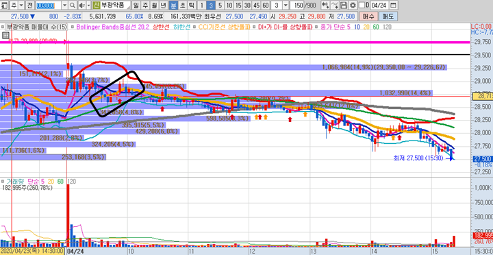 그러나 이와중에서도 짧은 수익을 실현할 구간이 있었으니, 거기는 바로 네모박스쳐놓은 구간 황금선 부근입니다. 왠지 처음부터 느낌이 별로 좋지는 않아서, 이종목은 짧게 나와야겠다 생각했는데, 저의 예상이 적중했습니다. 원래라면 네모박스 저구간에서 거래량이 꾸준히 상승되면서 전일고점을 다시 뚫기 위해 노력해야하는데, 그런 모습이 보이질 않으니 저렇게 주가가 힘없이 무너지는 겁니다. 이 종목이 전일고점을 뛰어넘을려면 피봇1차저항인 29500원 부터 터치를 해야하는데 그것도 가지 못하였고, 그러다보니 오늘은 힘을 못쓴것 같습니다. 어쨋든 저 부근에서 딱 한번으로 수익은 실현하게되었네요.
