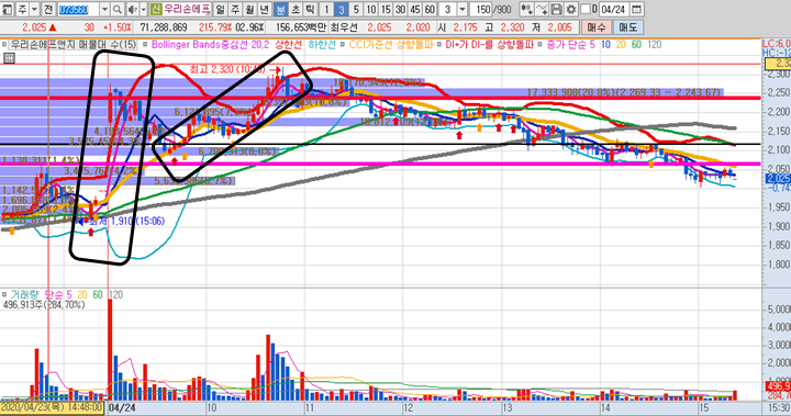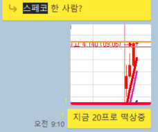 시초가가 10%이상 급등하면서 출발한 우리손에프앤지가 시간이 지나면서 점점하락하여 제가 좋아하는 지지라인 까지 내려왔습니다. 9시36분에 20일선을 지지하는 것을 확인하고 이렇게 다시 매수타점을 찍어주고 있는 장면 입니다.