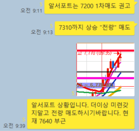 시초가에 장 시작전과, 장 시작후 공통적으로 알려드린 알서포트입니다. 9시부터 약 40분간 쉬지않고 엄청나게 급등한 종목이며, 제가 제시한 매도타점(1차,2차,3차) 모두 뚫어버린 정말 힘좋은 종목이였습니다. 그러나 오후2시경에 지지한다고 생각한 구간(6830원) 부근에서 매수를 하였으나, 지지하지 못한다 생각하여 마이너스 0.4% 손절 처리를 하였으나 다시 6930원 까지 상승하며, 저를 혼란하게 한종목이기도 합니다.