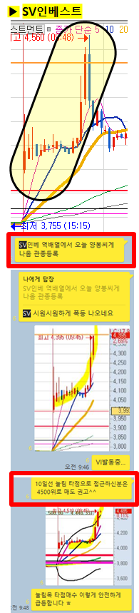 역배열에서 양봉이 나오기 시작하여 새롭게 공략한 SV는 장중최고 단 45분만에 21%이상 급등이 나왔습니다.
