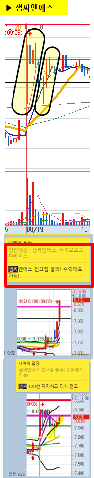 장전 예상종목 샘씨엔에스는 단 5분만에 피봇2차저항부근까지 사7%이상 상승이 나왔습니다.