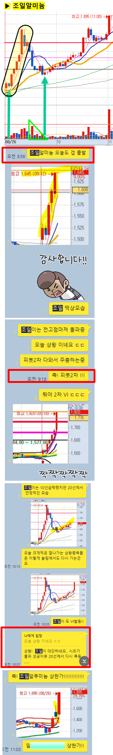 급등이후 잠시 쉬었다 다시 상승하는 종목중 공략하여 오늘도 아침부터 큰 수익을 실현하고 출발한 하루였습니다. 특히, 장전에 공유한 조일알미늄이 "상한가"에 진입했었고, 그외 종배 및 시초가 종목도 큰 급등이 나왔습니다.