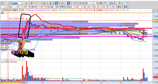 4월초에 최고가를 찍고 내려오는 중이였으며 역시 20일선에서는 기가막히게 다시 반응이 나와주고 있습니다. 오늘 자리가 음봉으로 마감이 되었는데 이 경우에는 바로 매수하지는 않고 몇일 더 기다려 보고 의미있는 구간에서만 새로 재 진입 계획을 세워보도로고 하겠습니다.
