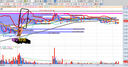 오늘의 일봉의 경우는 5일선부터 시작을 하였으며, 시세가 충분히 난 종목이였습니다. 앞으로 어떻게 될지는 모르지만 5500원대 까지 다시 하락시에 다시한번 도전해볼 예정 입니다.