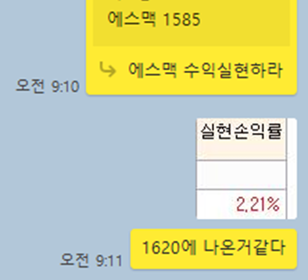 에스맥은 장 시작전에 급등을 예상하며 선정한 종목입니다. 특이하게도 장시작 전부터 이미 어마어마한 물량(백만주 이상)의 예상체결량으로 급등을 충분히 짐작하게 하였으며, 이 종목 또한 제가 언급한 자리(1585원)에서 무난하게 2% 부근의 수익 구간이 나왔습니다.