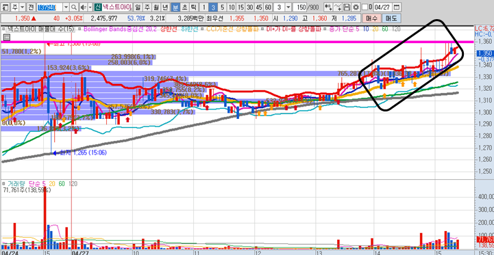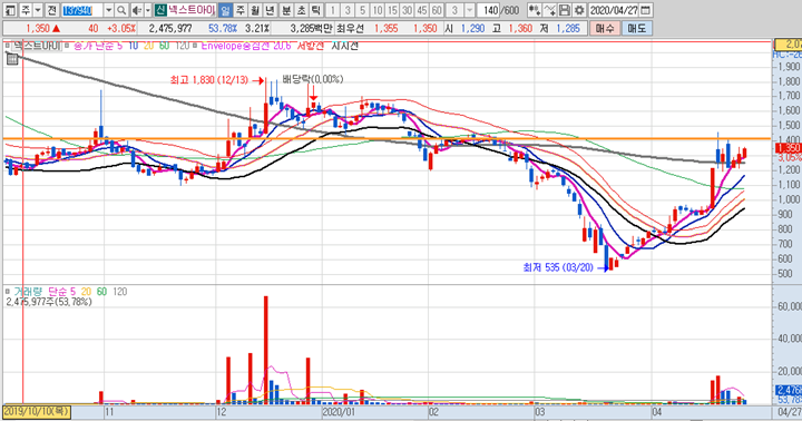 너무나 좋은 자리이며, 이번주 내내 지켜봐야할 관심종목으로 분류해놓기에 손색이 없어 보입니다. 넥스트아이는 중국소비주 및 2차전지 테마가 상승할 때 시세가 크게 나오는 종목으로 앞으로의 상황을 예의주시 해야 합니다.