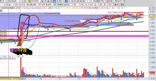 우상향인 것은 두말하면 잔소리겠지요? 항상 당일 단타를 치더라도 이렇게 차트가 아름답게 형성된것만을 선별하여 매매를 해야 합니다. 왜냐하면 만약에 조금 물리더라도 이런 우상향 차트에서는 금방 다시 살아날 수 있는 여력이 있기 때문입니다.