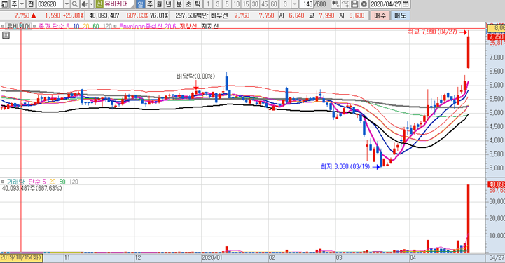 유비케어 일봉차트가 아주 예술입니다. 최근 주가중에서 신고가에 해당되며, 전일에 이동평균선이 모두 상방향으로 결집되어 있으며 오늘 제대로 불꽃쑈를 보여주기 위한 만반의 준비가 다 되어있엇습니다. 역시 아니나 다를까 제가 선정한대로 주가가 반응해주었습니다