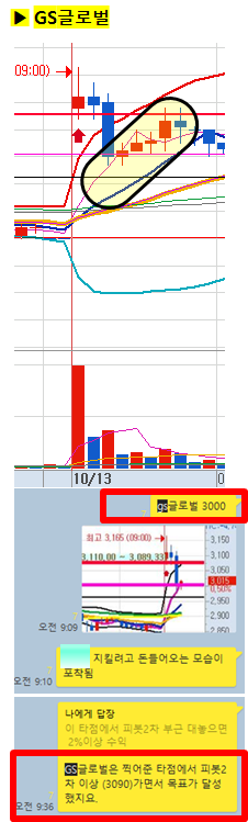 GS글로벌은 경동제약과 달리 2번째 캔들에서 바로 돌파가 나오지는 않았지만, 제가 제시한 눌림목 타점에서 다시 피봇2차 이상 상승이 나왔으니 안전하게 충분한 수익이 나온 종목입니다.