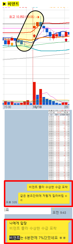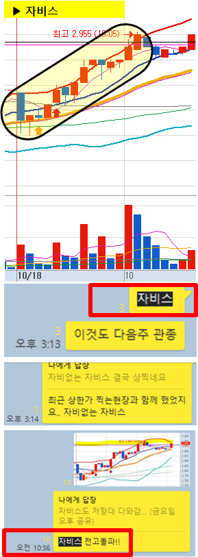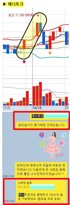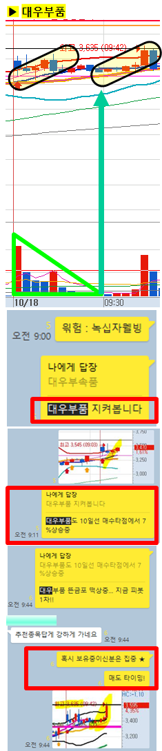 관전 포인트 : 카톡 대화내용 왼쪽에 표기된 언급한 시간을 유심히 보시기 바랍니다. 그 시간이후에 주가가 어떻게 상승하고 있는지 관찰하시면 매매에 도움이 되실 겁니다.