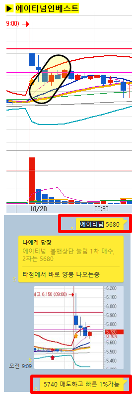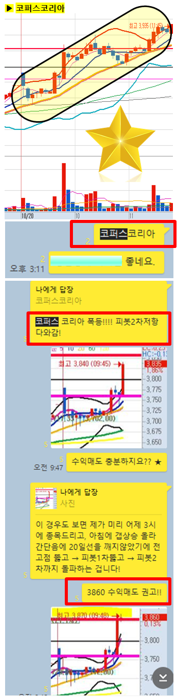 관전 포인트 : 카톡 대화내용 왼쪽에 표기된 언급한 시간을 유심히 보시기 바랍니다. 그 시간이후에 주가가 어떻게 상승하고 있는지 관찰하시면 매매에 도움이 되실 겁니다.