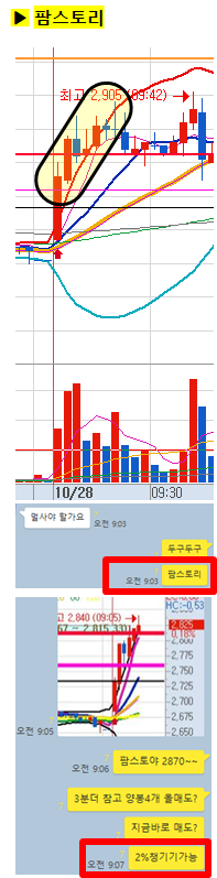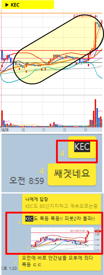 관전 포인트 : 카톡 대화내용 왼쪽에 표기된 언급한 시간을 유심히 보시기 바랍니다. 그 시간이후에 주가가 어떻게 상승하고 있는지 관찰하시면 매매에 도움이 되실 겁니다.