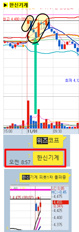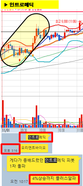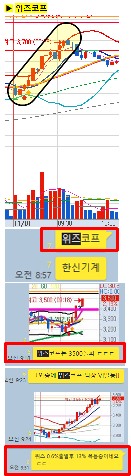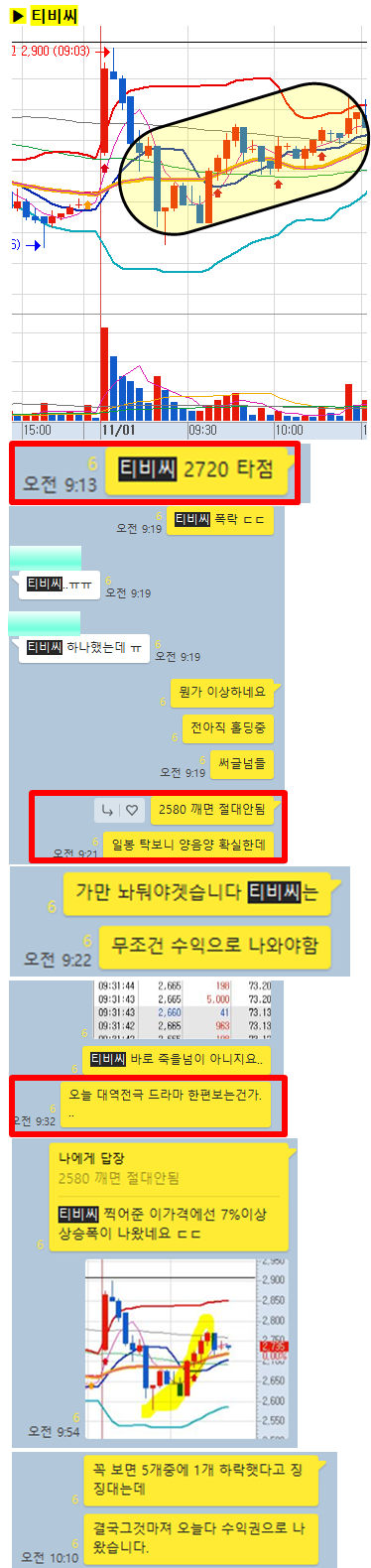 관전 포인트 : 카톡 대화내용 왼쪽에 표기된 언급한 시간을 유심히 보시기 바랍니다. 그 시간이후에 주가가 어떻게 상승하고 있는지 관찰하시면 매매에 도움이 되실 겁니다.