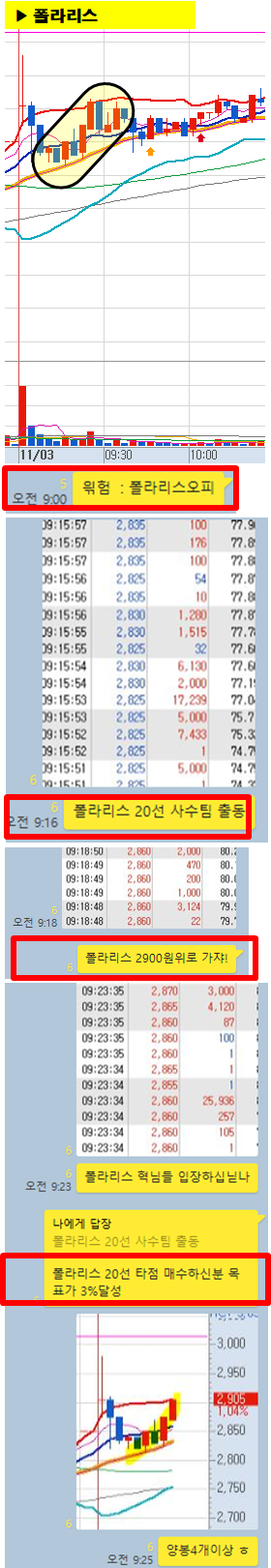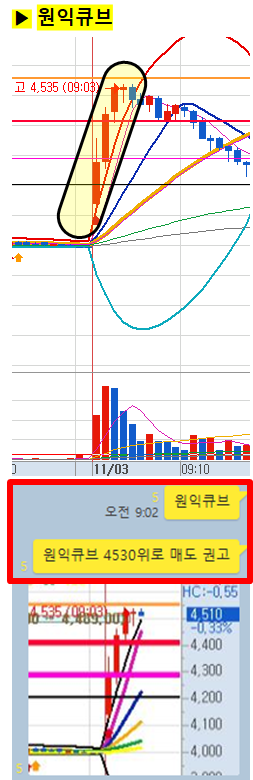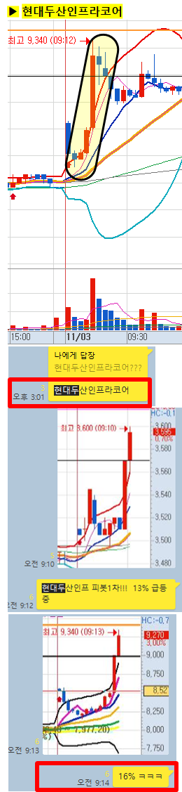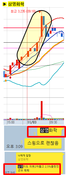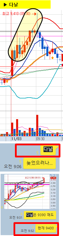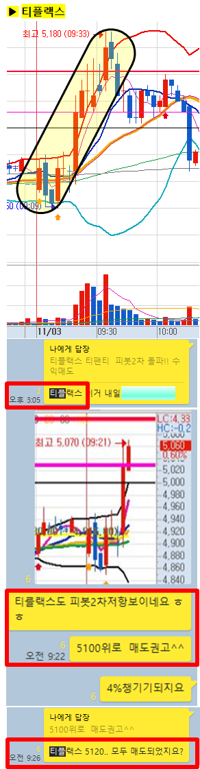 관전 포인트 : 카톡 대화내용 왼쪽에 표기된 언급한 시간을 유심히 보시기 바랍니다. 그 시간이후에 주가가 어떻게 상승하고 있는지 관찰하시면 매매에 도움이 되실 겁니다.