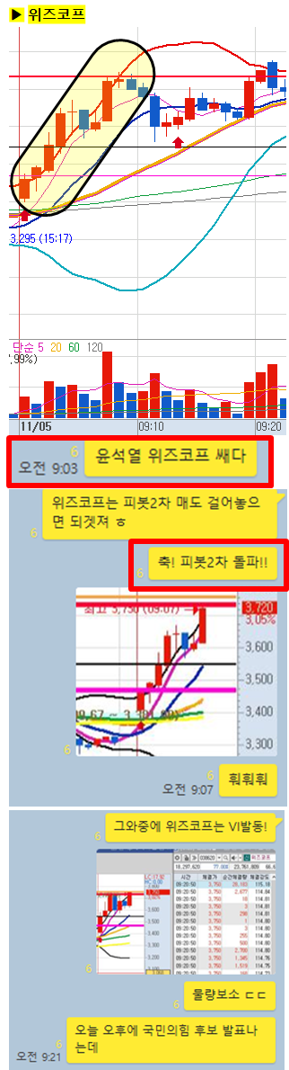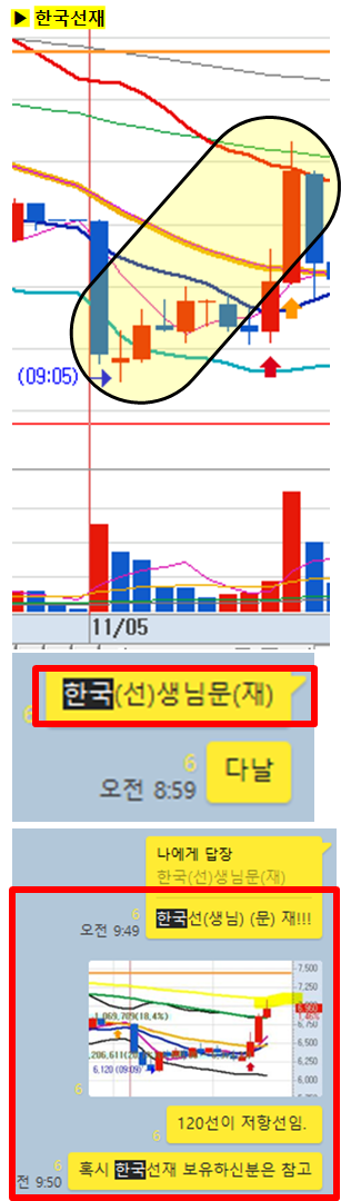 관전 포인트 : 카톡 대화내용 왼쪽에 표기된 언급한 시간을 유심히 보시기 바랍니다. 그 시간이후에 주가가 어떻게 상승하고 있는지 관찰하시면 매매에 도움이 되실 겁니다.