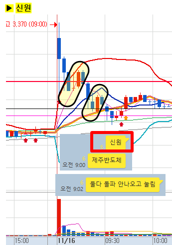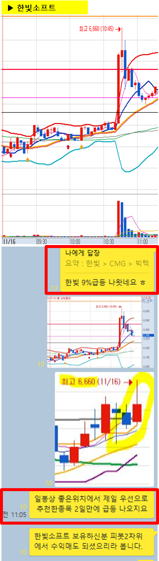 관전 포인트 : 카톡 대화내용 왼쪽에 표기된 언급한 시간을 유심히 보시기 바랍니다. 그 시간이후에 주가가 어떻게 상승하고 있는지 관찰하시면 매매에 도움이 되실 겁니다.