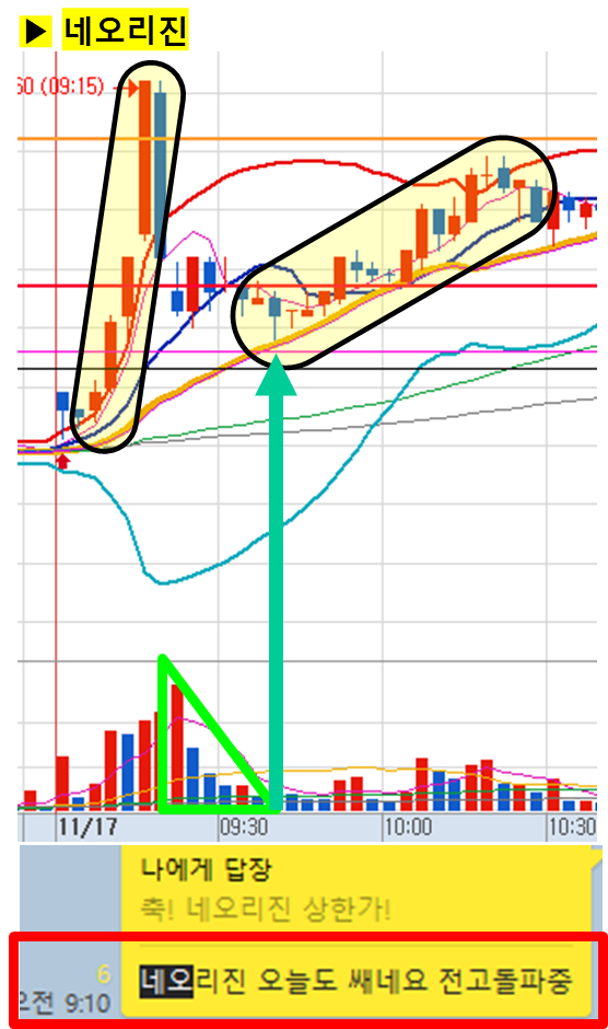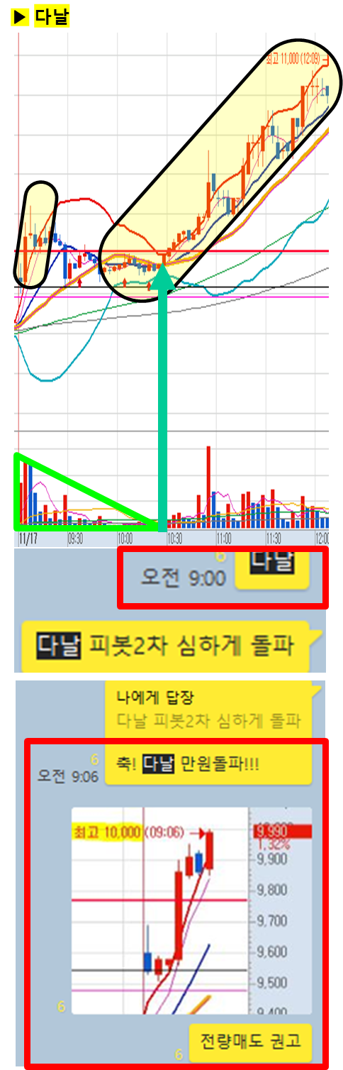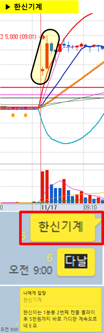 관전 포인트 : 카톡 대화내용 왼쪽에 표기된 언급한 시간을 유심히 보시기 바랍니다. 그 시간이후에 주가가 어떻게 상승하고 있는지 관찰하시면 매매에 도움이 되실 겁니다.