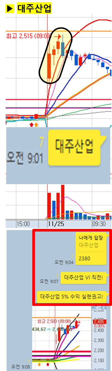 관전 포인트 : 카톡 대화내용 왼쪽에 표기된 언급한 시간을 유심히 보시기 바랍니다. 그 시간이후에 주가가 어떻게 상승하고 있는지 관찰하시면 매매에 도움이 되실 겁니다.