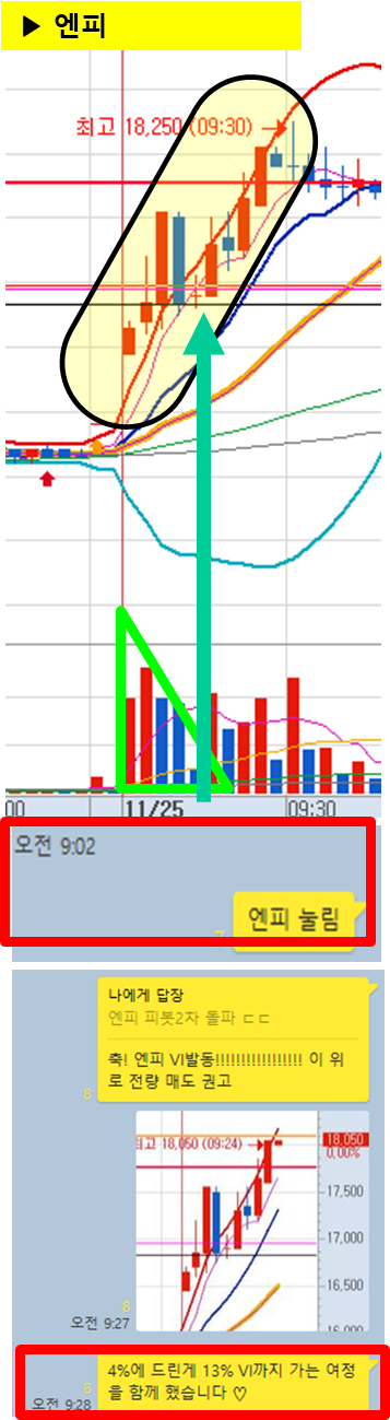 이미 알고있었던 종목으로 또 다시 새롭게 언급하여 푸짐하게 수익을 챙겼습니다. 특히 엔피는 4%시작하여 15%까지 급등하는데 30분이 걸렸습니다.