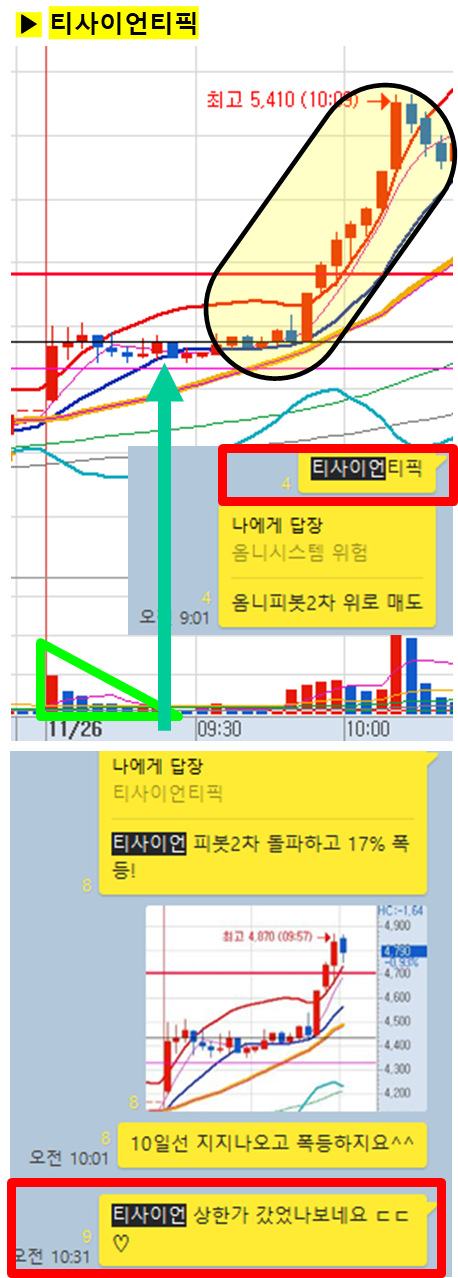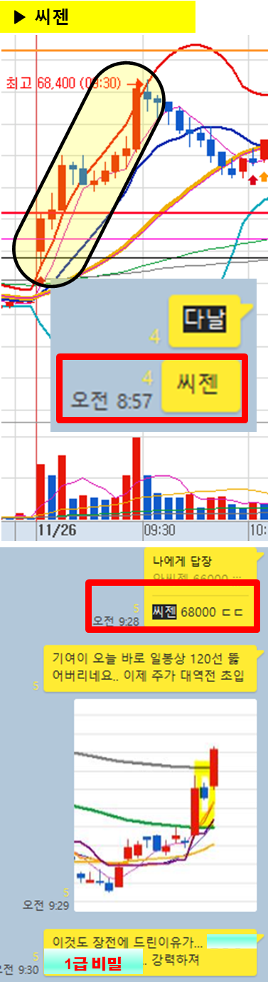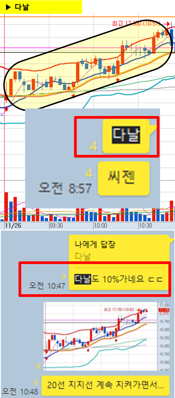 관전 포인트 : 카톡 대화내용 왼쪽에 표기된 언급한 시간을 유심히 보시기 바랍니다. 그 시간이후에 주가가 어떻게 상승하고 있는지 관찰하시면 매매에 도움이 되실 겁니다.