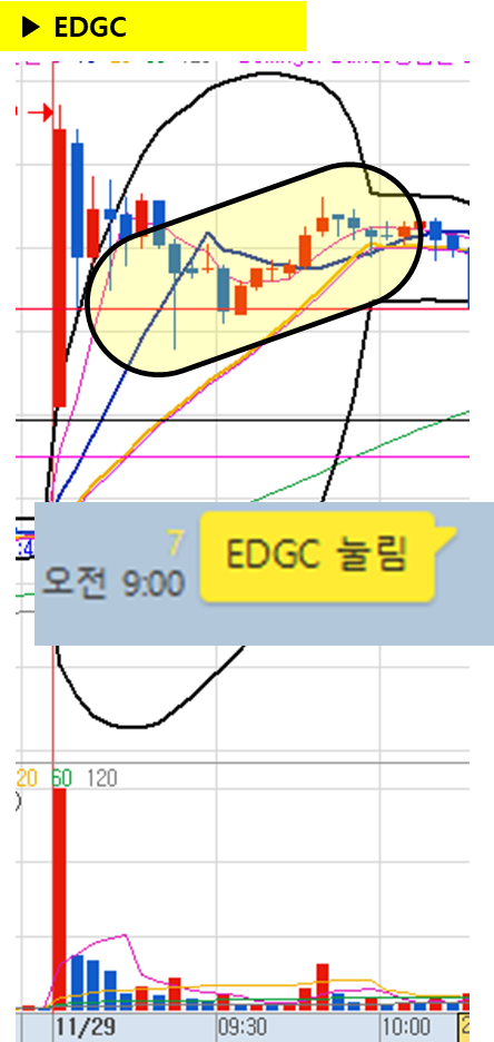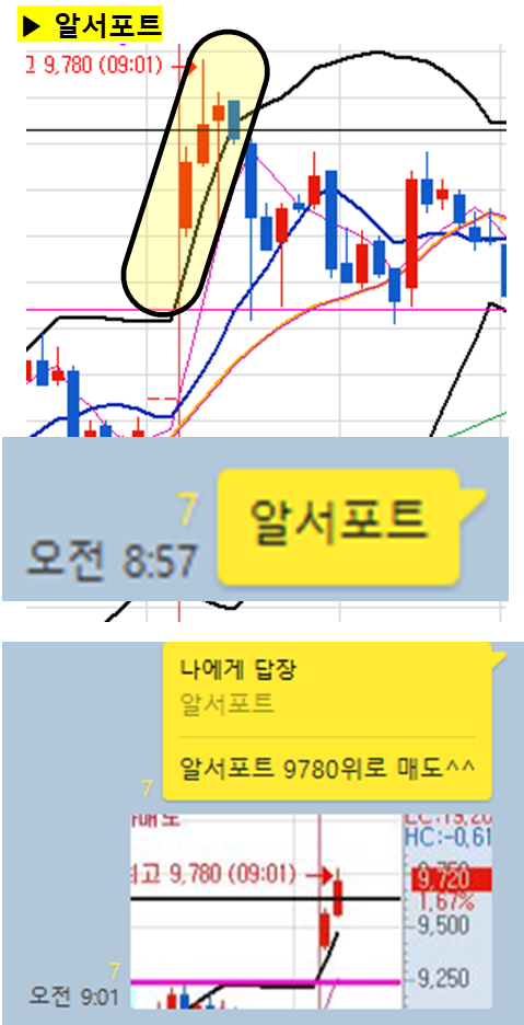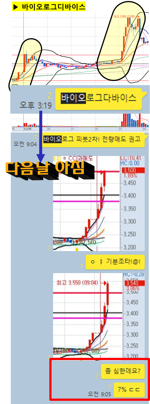관전 포인트 : 카톡 대화내용 왼쪽에 표기된 언급한 시간을 유심히 보시기 바랍니다. 그 시간이후에 주가가 어떻게 상승하고 있는지 관찰하시면 매매에 도움이 되실 겁니다.