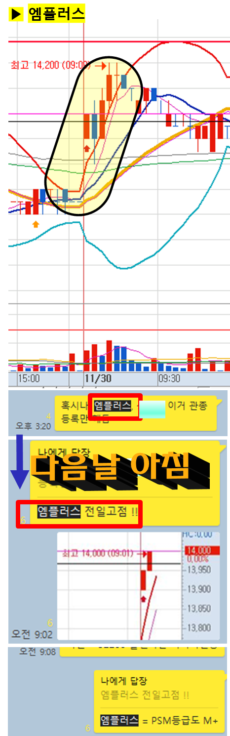 11월 마지막 매매는 비교적 차분하게 마무리 하였습니다. 종가에 언급한 엠플러스, 당일 공략 다날 & 비덴트의 상승포인트를 확인해보겠습니다.