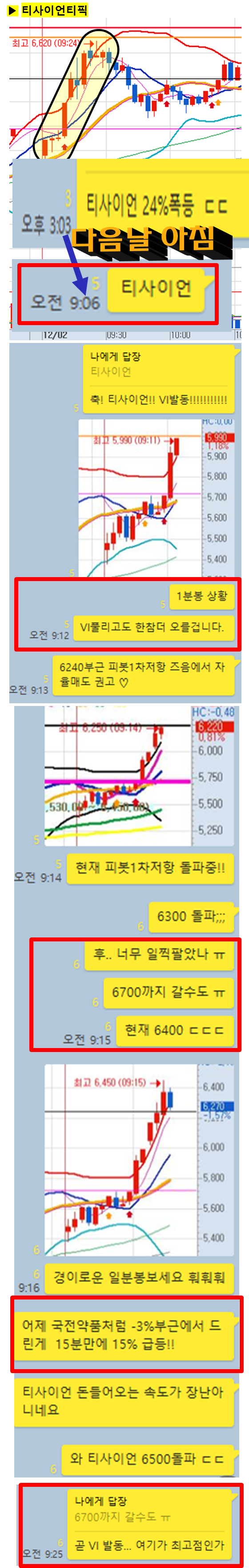 계속 언급된 종목을 재탕해서 좋은결과가 있었습니다. 특히 티사이언티픽은 오늘도 -3%부근 공유한 이후 24분만에 18%폭등이 있었습니다.