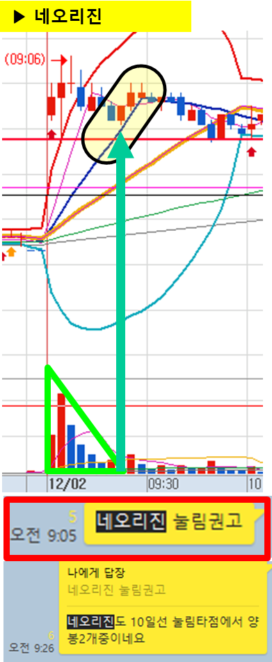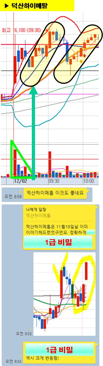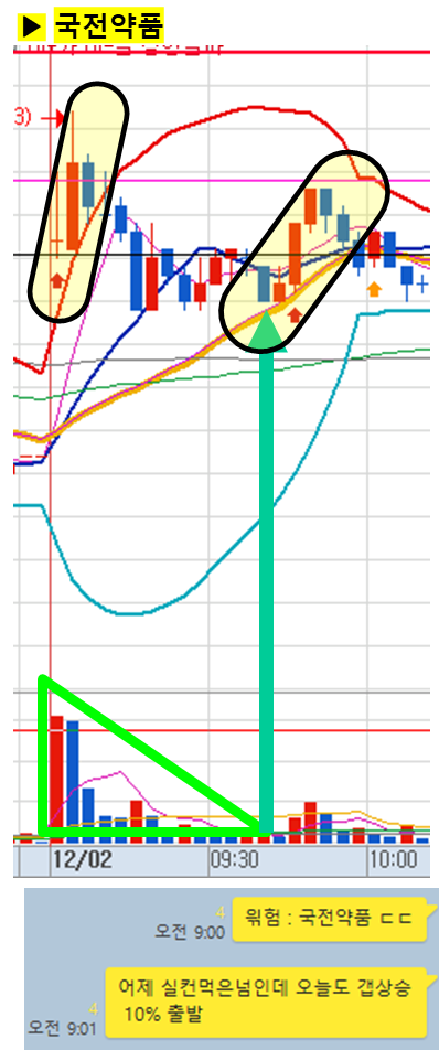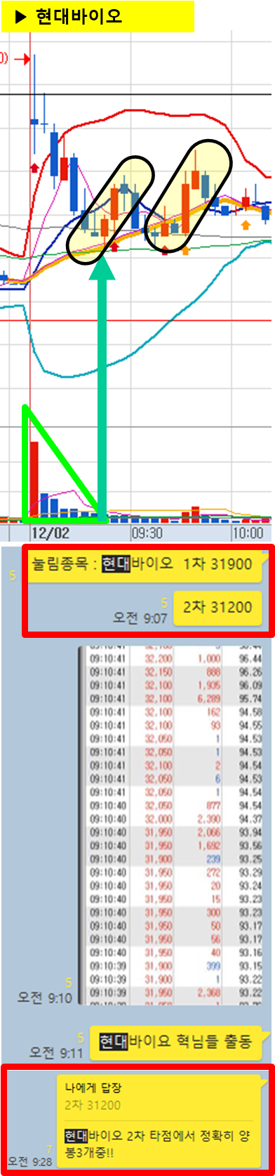 관전 포인트 : 카톡 대화내용 왼쪽에 표기된 언급한 시간을 유심히 보시기 바랍니다. 그 시간이후에 주가가 어떻게 상승하고 있는지 관찰하시면 매매에 도움이 되실 겁니다.