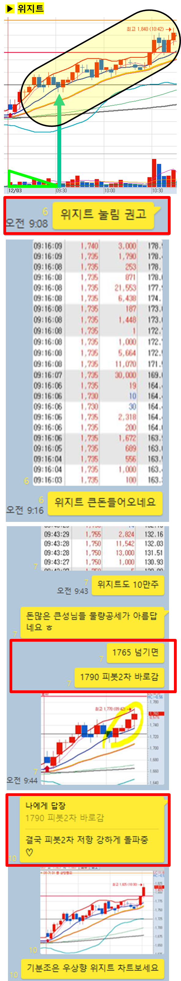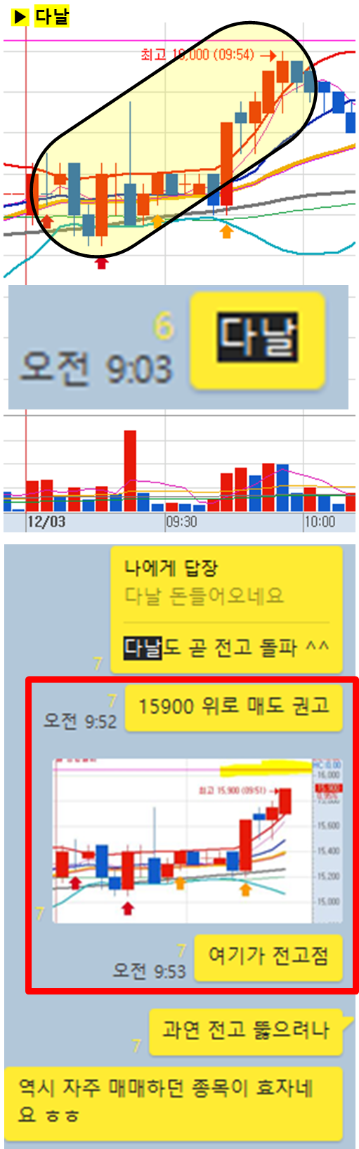 관전 포인트 : 카톡 대화내용 왼쪽에 표기된 언급한 시간을 유심히 보시기 바랍니다. 그 시간이후에 주가가 어떻게 상승하고 있는지 관찰하시면 매매에 도움이 되실 겁니다.