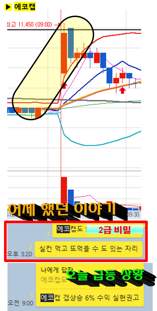 관전 포인트 : 카톡 대화내용 왼쪽에 표기된 언급한 시간을 유심히 보시기 바랍니다. 그 시간이후에 주가가 어떻게 상승하고 있는지 관찰하시면 매매에 도움이 되실 겁니다.